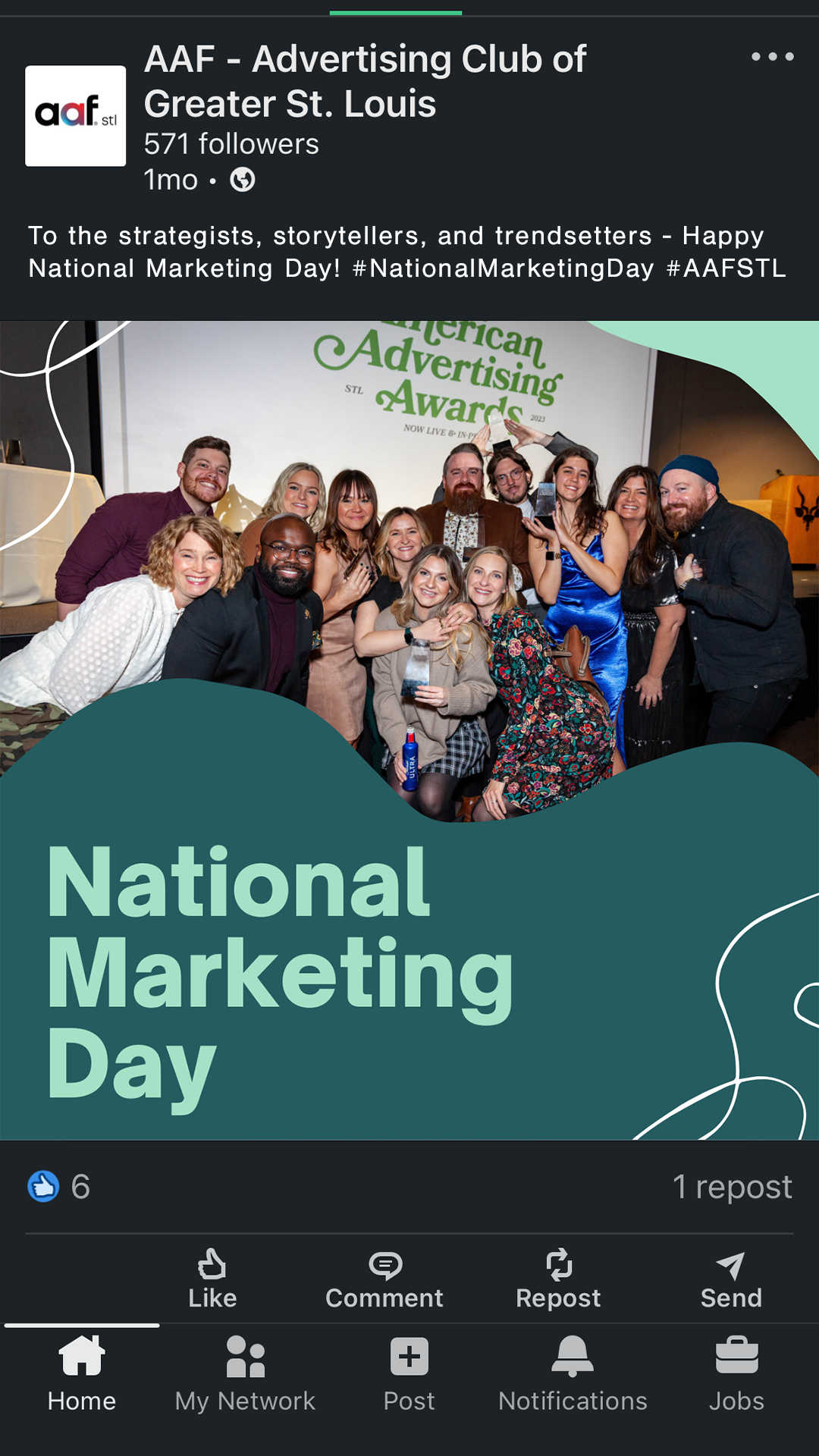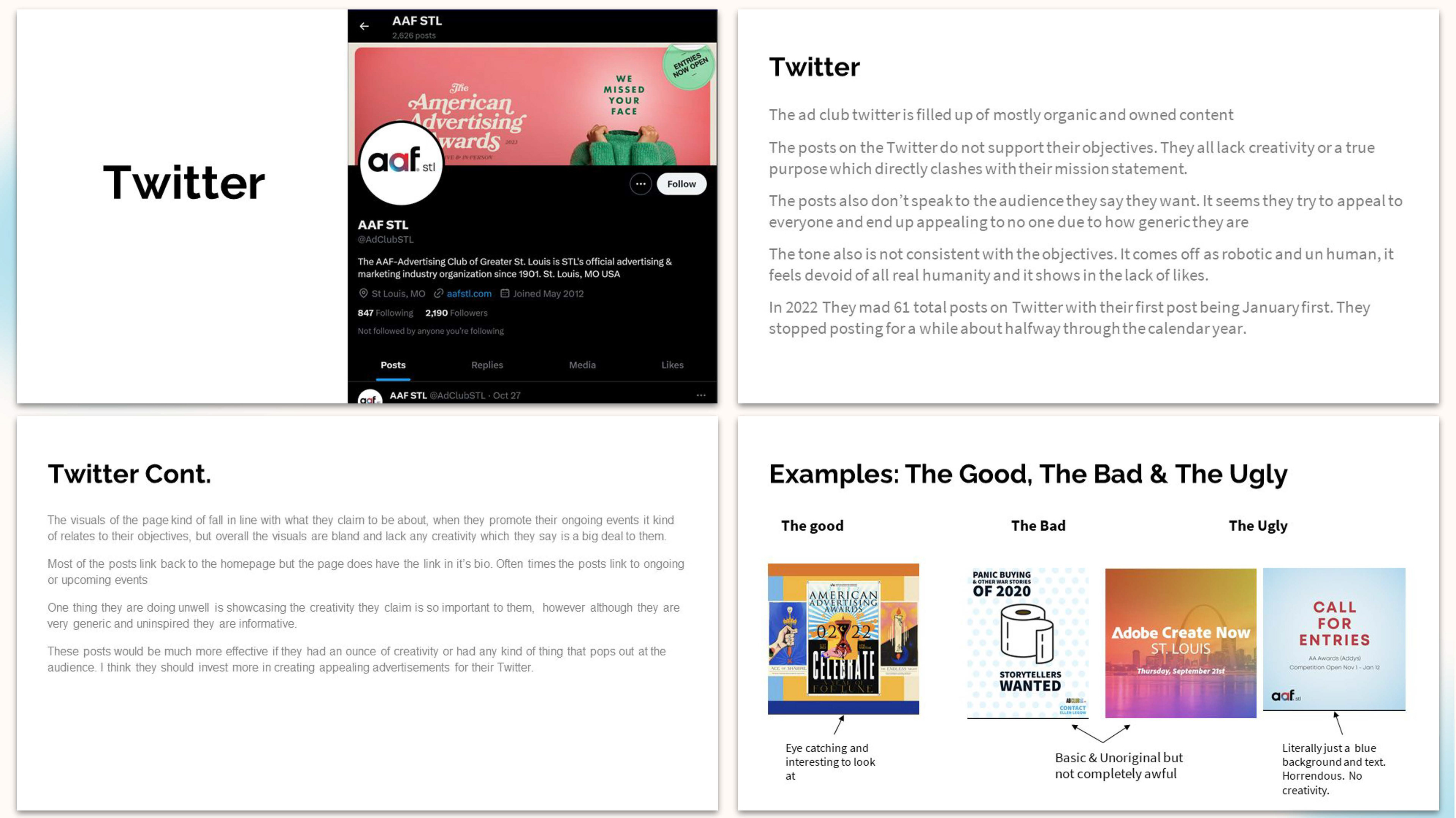 For the last 8 weeks of the semester, small groups in my ADVT 3600 Social Media Content and Development class were assigned to create a social media plan for a non-profit organization - I worked with AAF STL, a branch of the American Advertising Federation. We were tasked with completing a social media audit, a presentation with strategic recommendations as well as creating a Canva account with sample content posts the organization can utilize on social media.